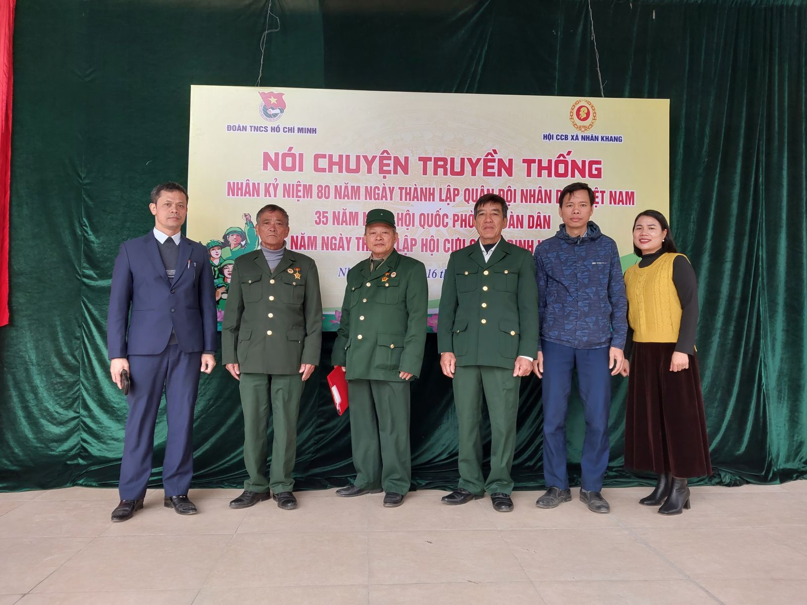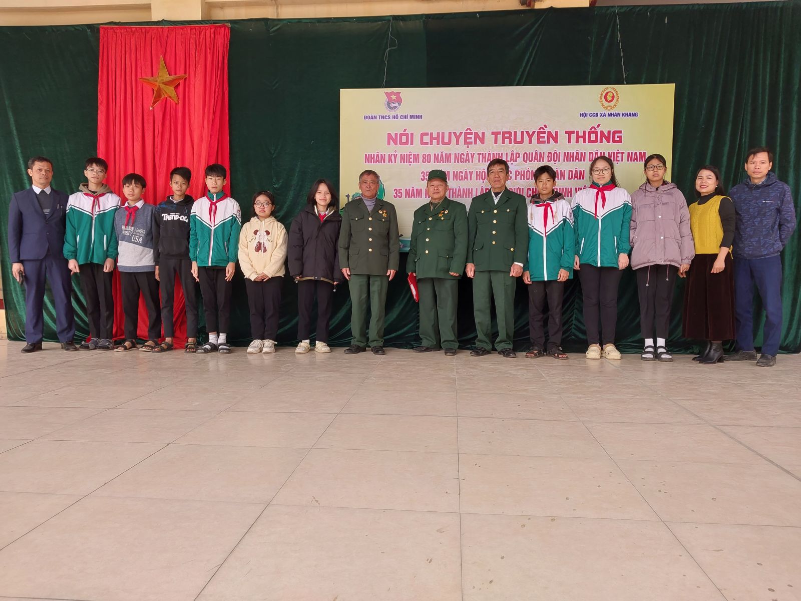 Đến tham dự buổi giao lưu với các cháu học sinh có các bác trong hội cựu chiến binh xã Nhân Khang, Bí thư đoàn xã, tập thể ban giám hiệu nhà trường, các thầy cô giáo, cùng các 520 em học sinh. Chủ tịch Hội CCB nói chuyện truyền thống về lịch sử vẻ vang của Quân đội nhân dân Việt Nam, những chiến công hiển hách của quân và dân ta trong hai cuộc kháng chiến chống thực dân Pháp và đế quốc Mỹ, hoàn thành thắng lợi sự nghiệp đấu tranh giải phóng dân tộc, thống nhất đất nước, bảo vệ vững chắc Tổ quốc Việt Nam xã hội Chủ nghĩa. Bằng dẫn chứng và những câu chuyện chân thực về những trận đánh ác liệt, tình đồng chí, đồng đội trong lửa đạn chiến tranh và về cuộc sống của các cựu chiến binh trong thời chiến và thời bình.