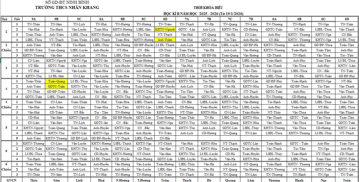 Thời khoá biểu thực hiện từ 19/01/2026